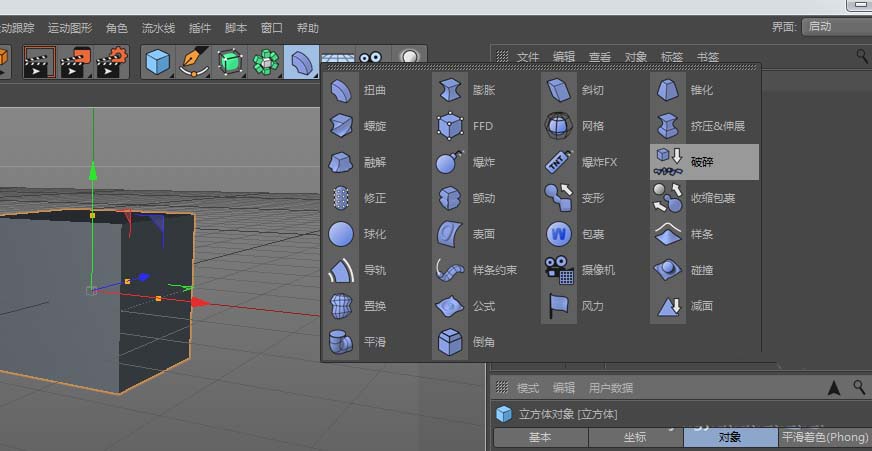 2、新建变形器-破碎,并将破碎放到立方体的子级;