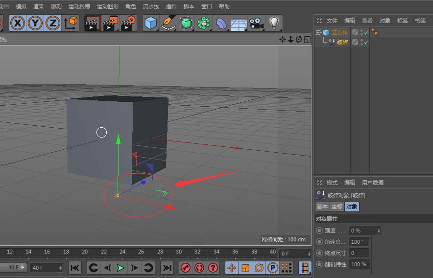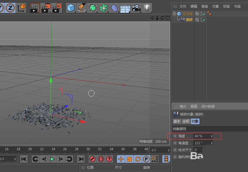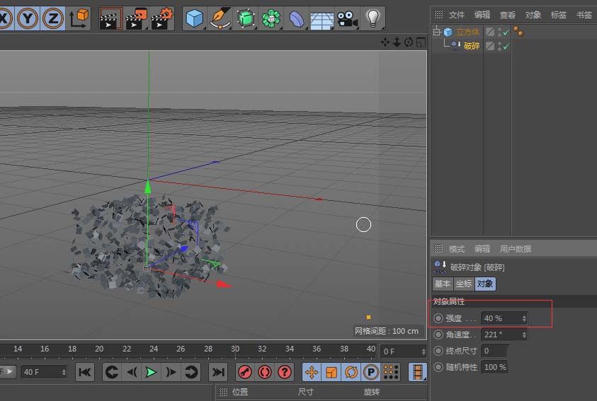 4、将破碎强度调至40,可看到立方体向下碎裂;