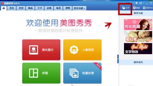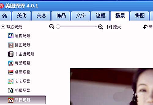 2、在【打开一张图片】中选择图片名称,打开在美图秀秀软件,在单击【场景】中静态场景,再单击【静态场景】中的【节日场景】。