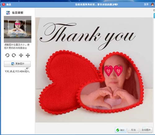 4、在【场景调整】框中调整相片的位置和大小,调好后点击确定。