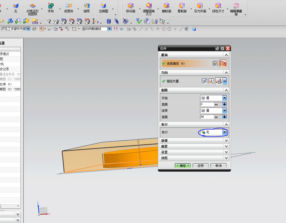 3、拉伸生成实体,注意不要是求和或其他的,选择无就好了
