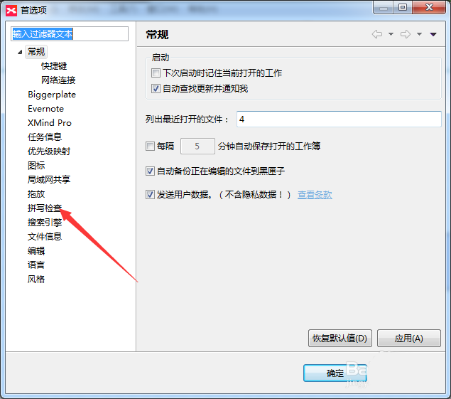 3、进入到了首选项的窗口的界面中,进行选中列表中的拼写检查的选项。