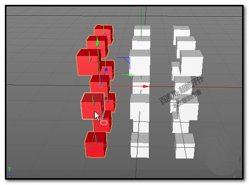 7、然后,在材质面板中,双击鼠标创建材质;设置材质为红色;然后,按数字0,框选工具;把左边这一排立方体全框选中(本步骤第二张图);再把材质拖到选中的立方体这里来。这些立方体即变成红色(本步骤第三张图)