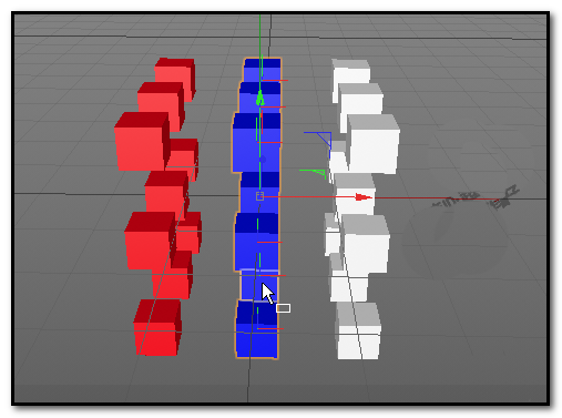 6、比如,如图中所示的方向,左边一排添加红色,中间一排添加蓝色,右边一排添加黄色。我们先要把克隆给C一下,选中克隆,按下快捷键:C,改为可编辑对象。