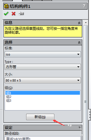 3、绘制3D草图,插入——焊件——结构构件——定义构件轮廓——选择草图边线——确定。