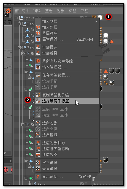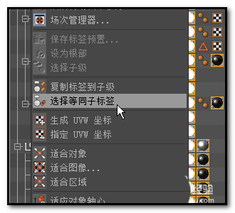 6、然后,鼠标右击该标签,,弹出菜单中点:选择等同子标签(本步骤第一张图所示);这时,我们可以看到整个对象面板中的所有纹理标签都给选中了(第二张图)。