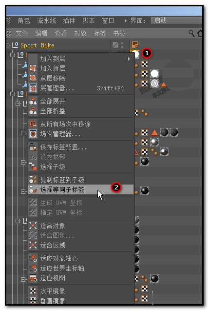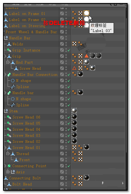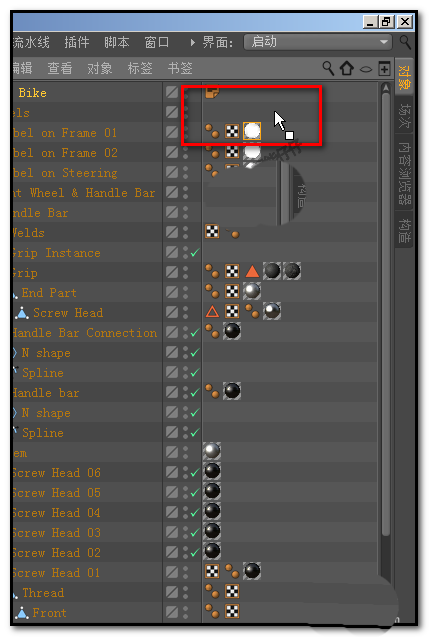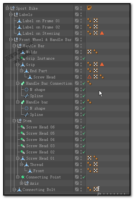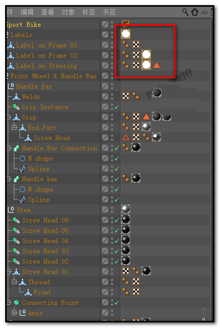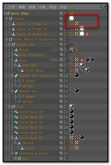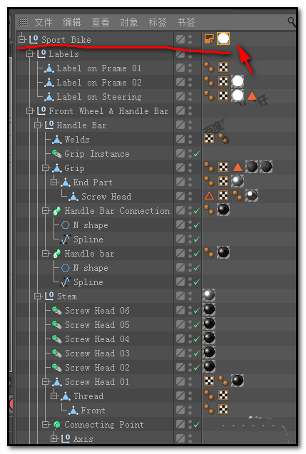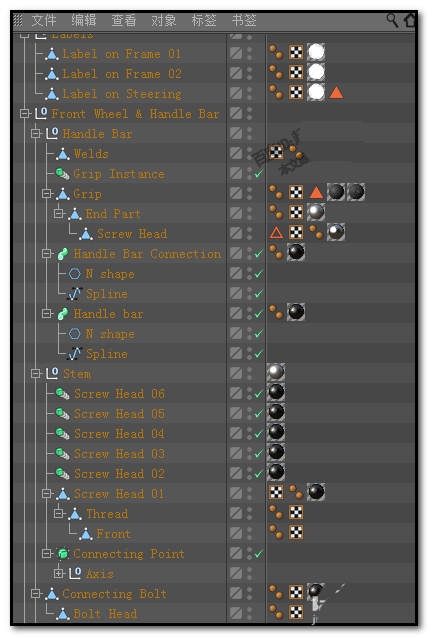 1、如下图中所示,这是从C4D预置中调出来的一个自行车模型的对象面板;这里使用着大量的纹理标签,假设,我们现在要把这所有的纹理标签给删除掉。