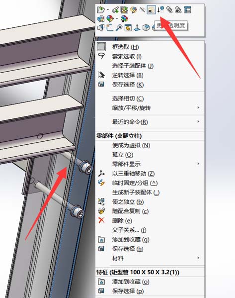 6、我们观察完之后可以将零件的透明度改回去,这个时候也是右击,注意零件透明了,有可能选不准,要注意选择的角度。