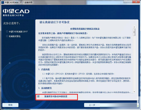 4.简要的阅读中望CAD2017机械版的许可协议,并在勾选接受协议后执行下一步;