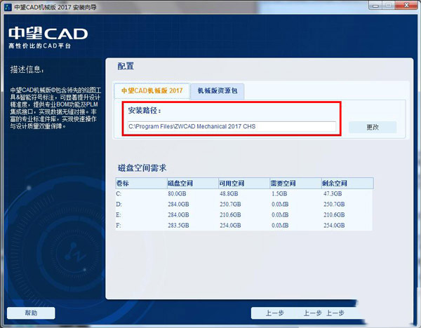5.选择中望cad2017机械版的合适安装路径,并点击下一步;