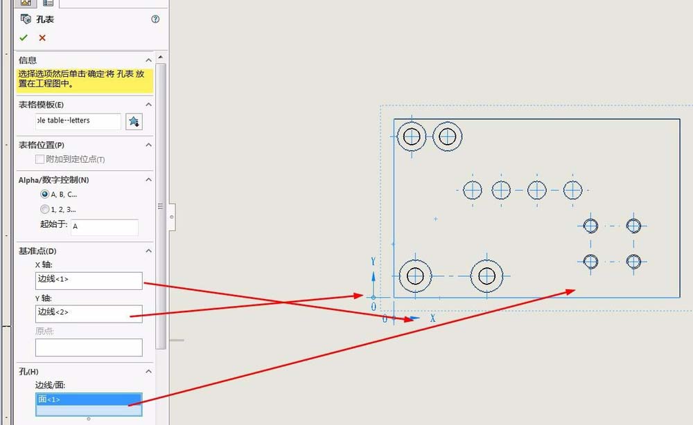 3、分别选取x轴和y轴,也可以直接选择一个点作为原点。另外需要选择一个面.点击确认,则孔的位置是以原点为基准来表示的。