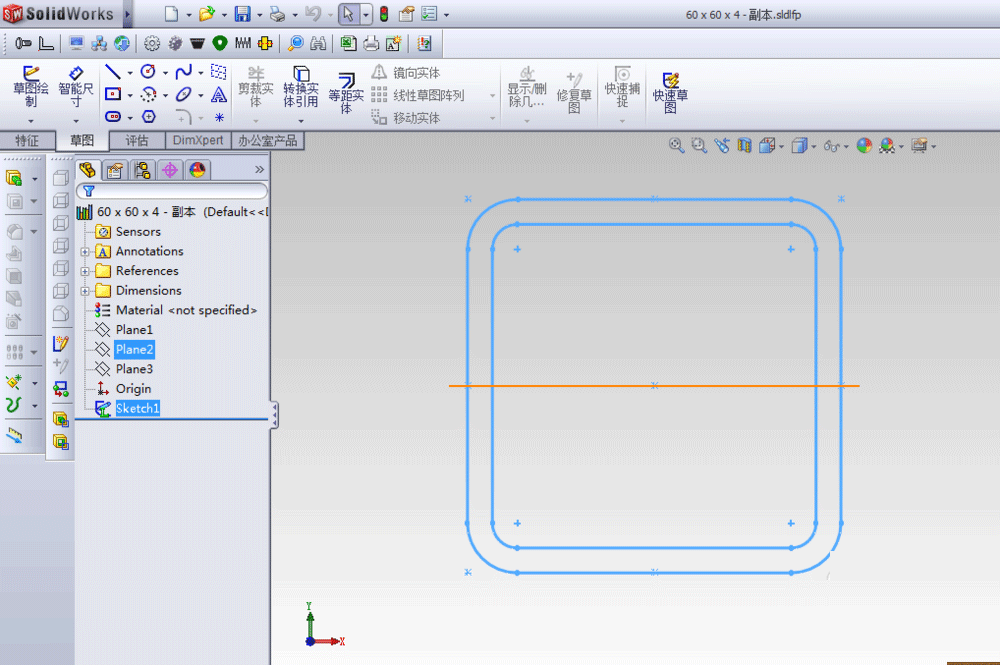 14、退出之前的文件,回到solidworks文件,再次点开矩形框的大小下拉菜单,70X70X4.5就出现在下拉菜单中。