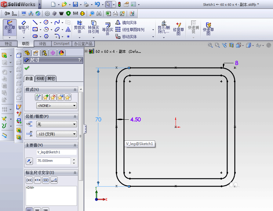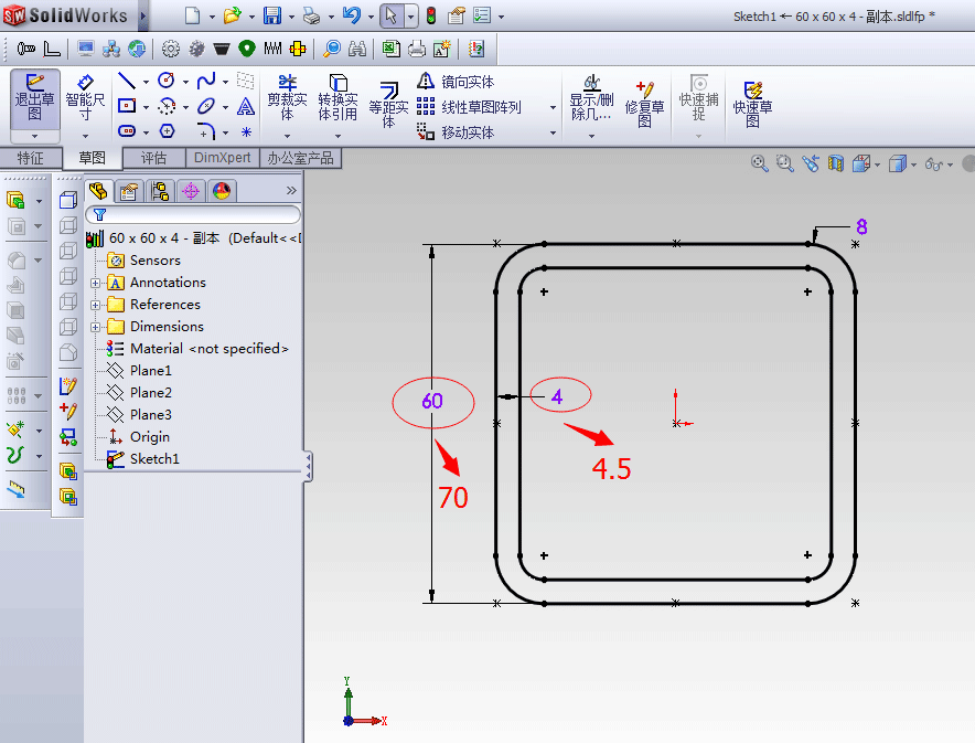 12、双击图中的尺寸,将60改为70,厚度4改成4.5,保存草图绘制后,保存文件后退出solidworks。