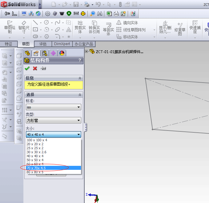 15、选择70X70X4.5后,点击主界面的草图线条,就可以将矩形管添加上去了!
