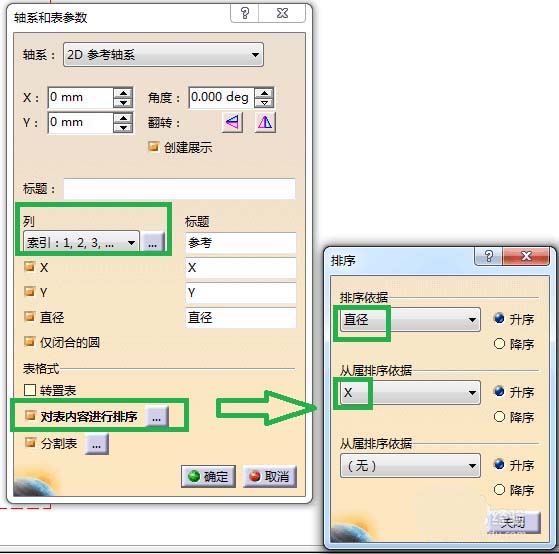 4、这时会出现“轴系和表参数”对话框。按如图所示设置“列”中的“索引1,2,3”,以及“排序”中的“排序依据”。