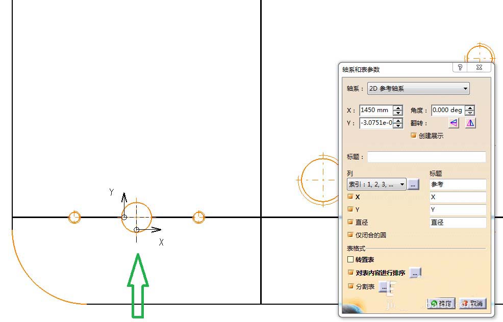 6、选中一个基准孔,选择其轴线作为X轴与Y轴,然后点击“确定”关闭“轴系和表参数”对话框。