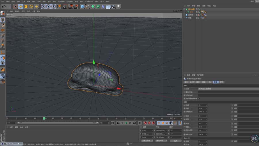 4、隐藏立方体,更改文字柔体选项中的构造为20,斜切为20,弯曲为20,跟随旋转为20。播放动画,等文字完全坍缩下去之后点击动力学中的设置初始形态,然后返回第一帧,为文字的硬度和压力K帧,硬度从小变大,文字就会由坍缩的状态慢慢站立鼓胀起来。