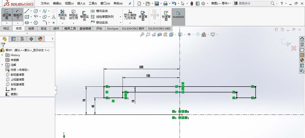 1、打开SolidWorks2016,新建一个零件模型。选择前视基准面,绘制草图。绘制具有如图所示几何关系的草图。