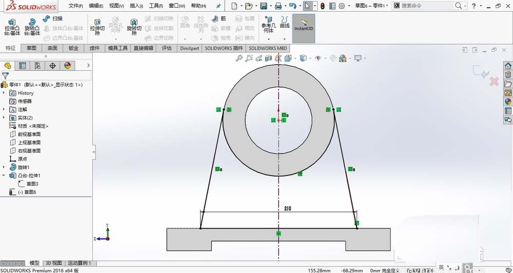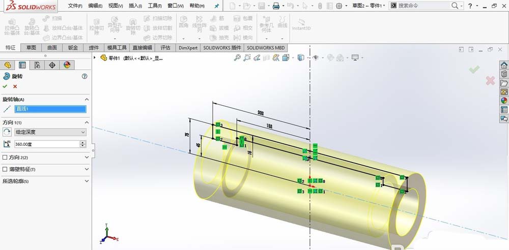 2、单击特征,“旋转凸台/基体”命令,选择如图所示中心线作为旋转轴,其它参数保持默认,单击确定,生成旋转凸台。