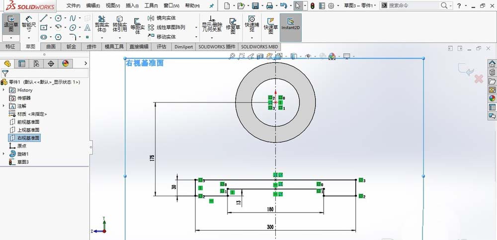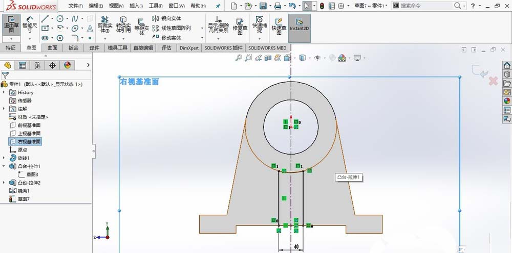 8、正视于右视基准面,在右视基准面上绘制草图。绘制具有如图所示几何关系的草图。