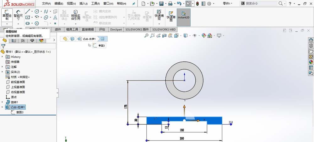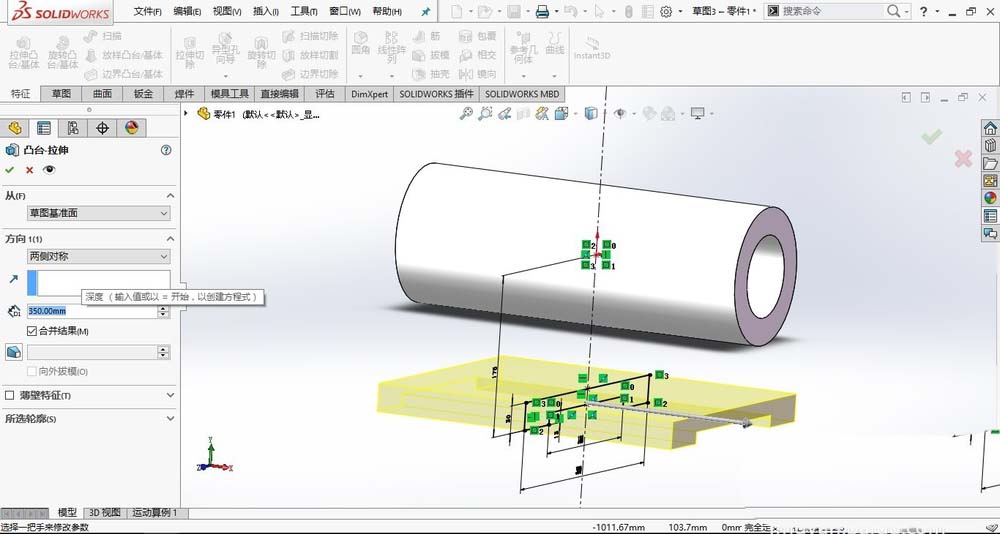 4、单击特征,“拉伸凸台/基体”命令,方向选择“两侧对称”,深度设置为“350 mm”,单击确定,完成拉伸凸台的创建。