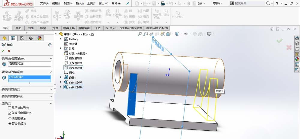 7、单击特征,“镜像”命令,镜像面选择右视基准面,镜像特征选择“凸台-拉伸2”,单击确定,完成镜像。