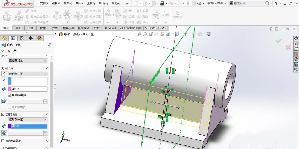 9、单击特征,“拉伸凸台/基体”命令,方向1和方向2都选择“成形到一面”,分别选中如图所示的端面,单击确定,完成拉伸特征创建。
