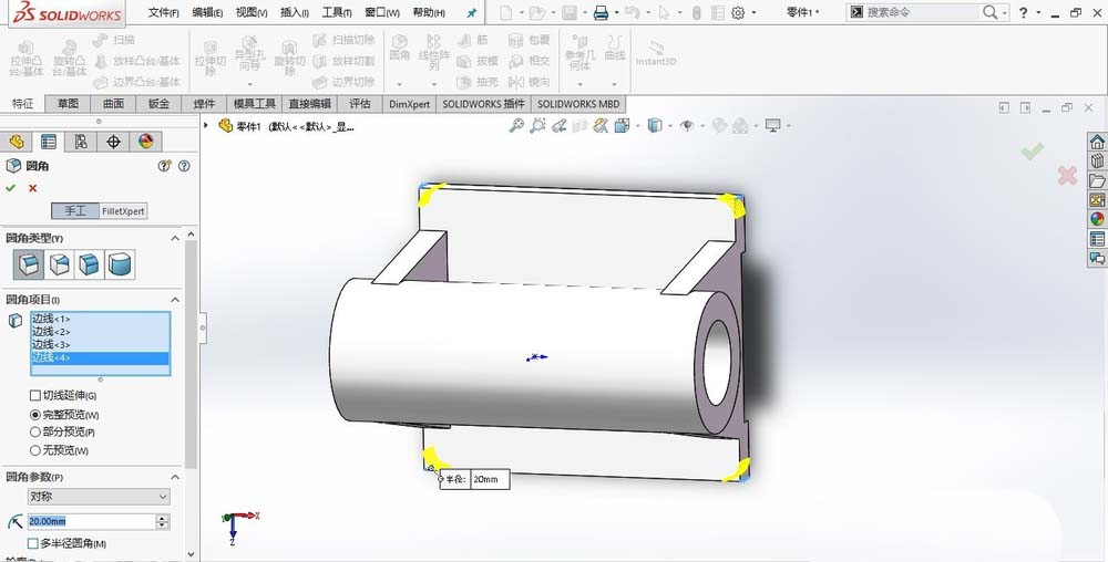 10、创建“圆角1”。单击特征,“圆角”命令,选择如图所示边线,圆角半径设置为“20 mm”,单击确定。