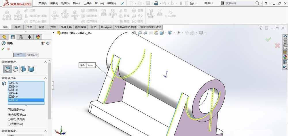 11、创建“圆角2”。单击特征,“圆角”命令,选择如图所示边线,圆角半径设置为“3 mm”,单击确定。