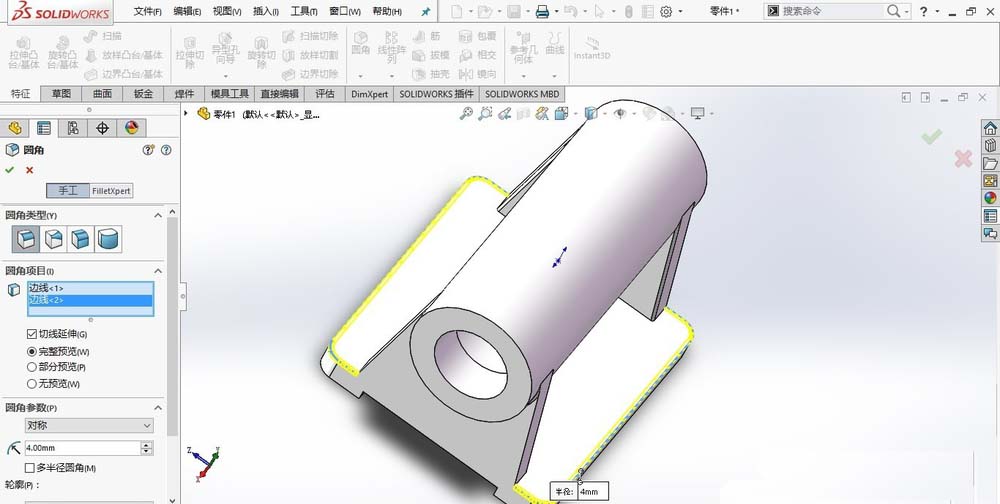 12、创建“圆角3”。单击特征,“圆角”命令,选择如图所示边线,圆角半径设置为“4 mm”,单击确定。