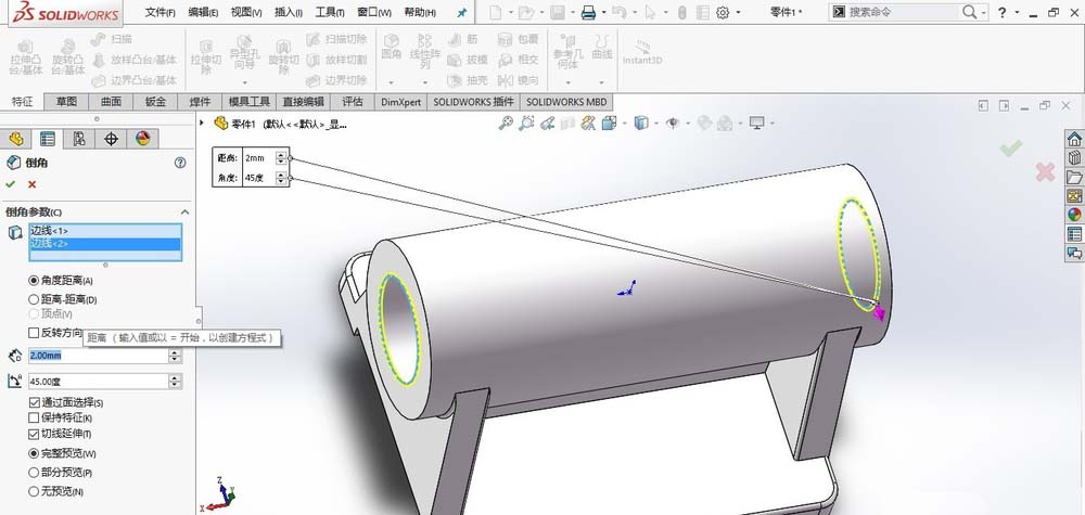 13、创建“倒角1”。单击特征,“倒角”命令,选择如图所示边线,倒角距离设置为“2 mm”,单击确定。