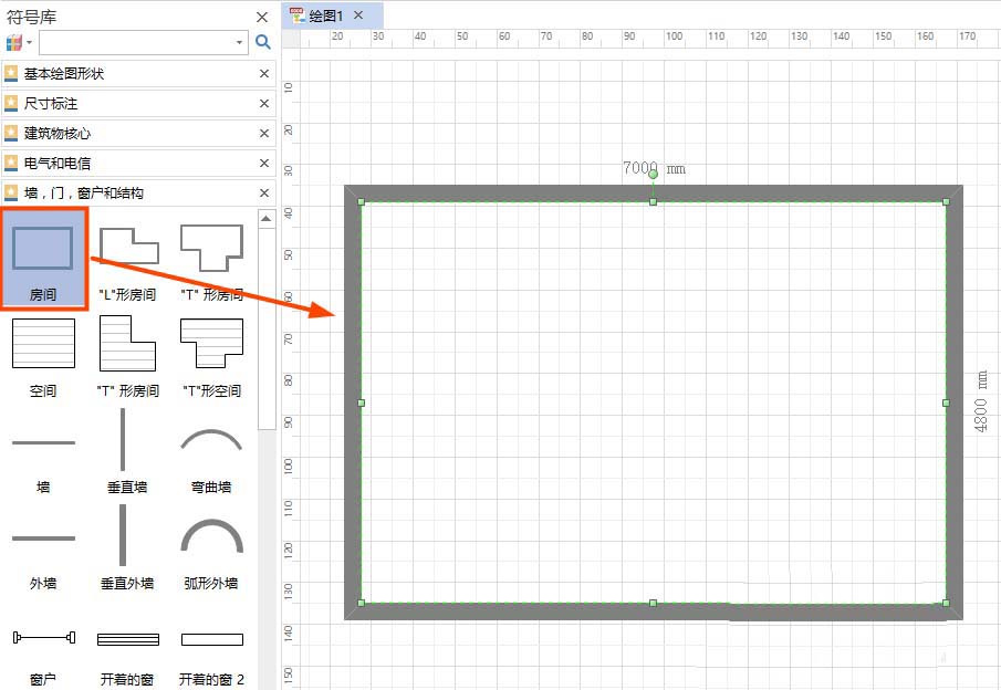3、从“墙、门、窗户和结构”符号库里面,拖拽墙壁形状到绘图页面。拖拽绿色控制点更改墙壁大小或者改变墙壁长度值。拖拽一面墙壁到另一面墙壁,当结束点变成红色,松开鼠标,两面墙壁就会吸附在一起。