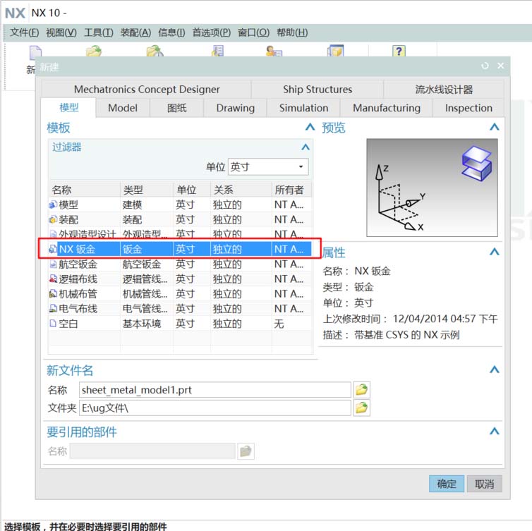 1、找开UG,选择新建钣金(在建模中也可直接转换到钣金模式);创建一突出块。这是钣金的基本件。