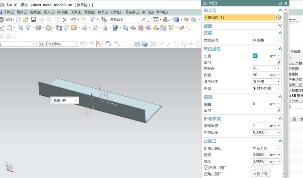 4、选择弯边,如图在对话框中设定参数,得到一边折弯了的钣金件。那怎样才能得到折弯后开圆槽的效果呢。