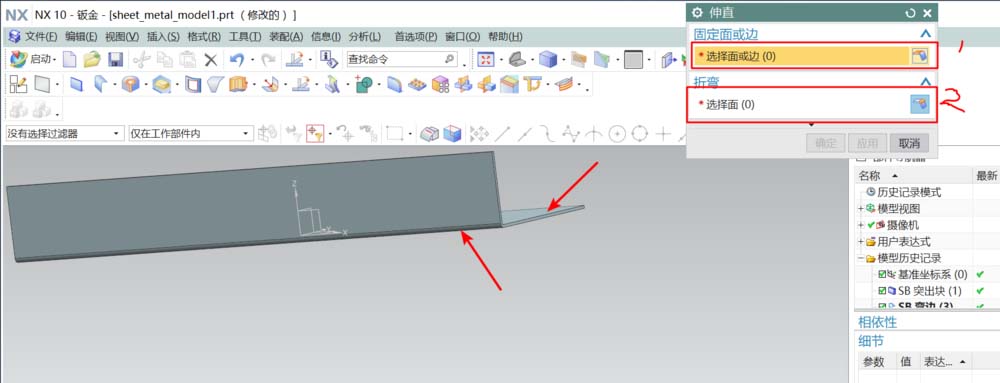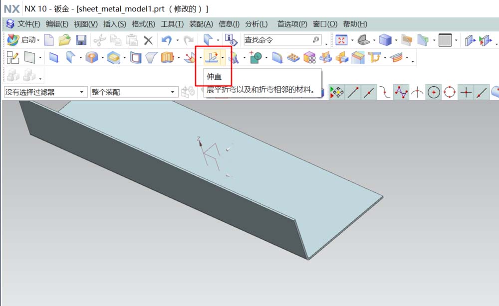 5、先选择“伸直”命令,如图的把固定面及折弯面选择好后确定,得到将折弯的钣金展开的效果。