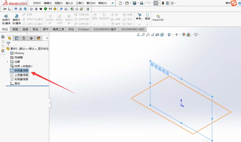 2、在新的零件图里面我们需要一个零件,零件需要我们先绘制草图。选择一个基准面绘制草图。