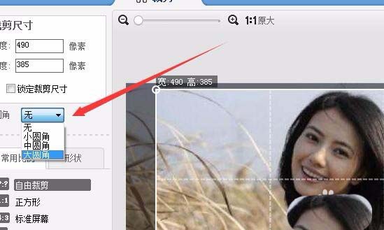 4、接着点击左侧的“圆角”下拉菜单,在弹出菜单中选择“大圆角”菜单项。