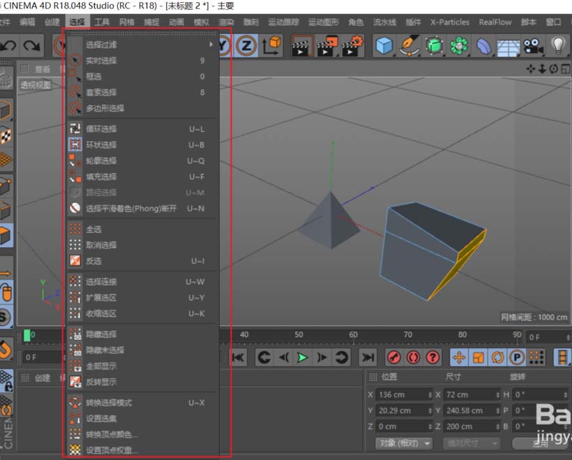 1、在软件的菜单列表中,选择就排在第四占用了一大列,可见其重要性。展开可以看到一大堆关于选择的命令。这里介绍下选中的点线面进行切换的操作。
