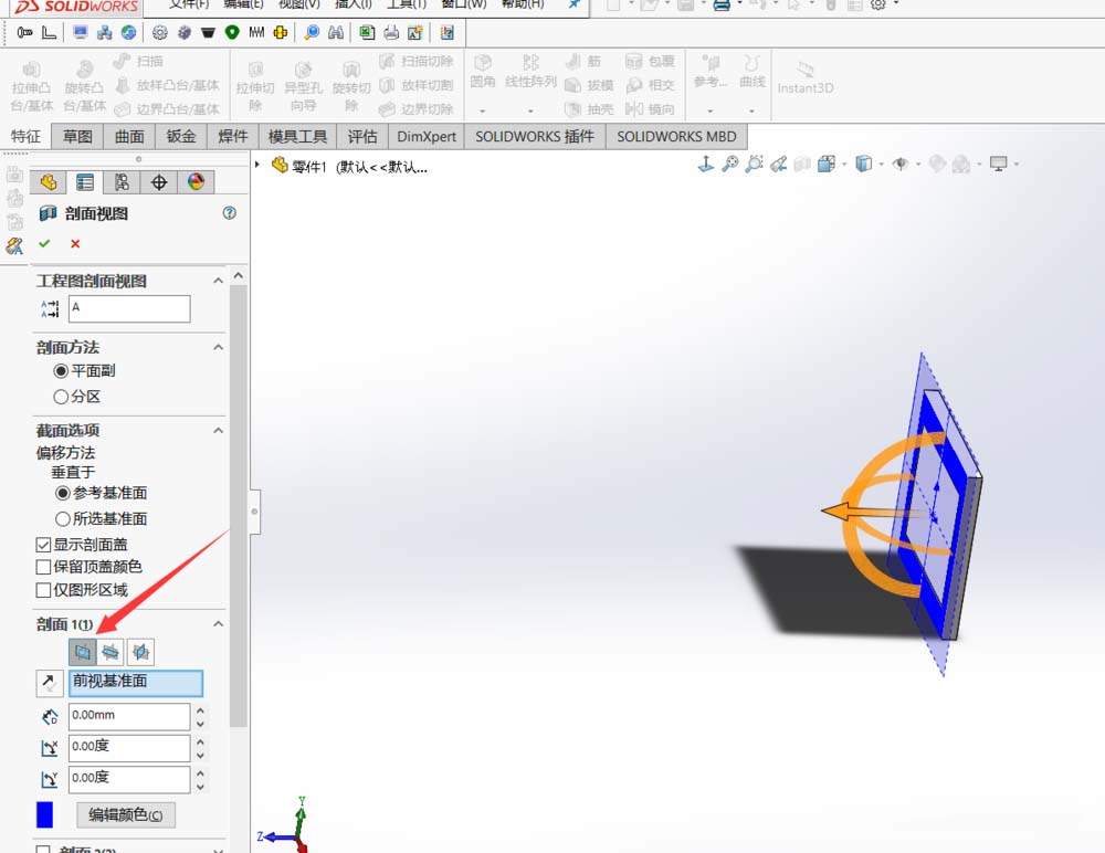 3、点击之后可以看到零件图上出现了三个方向的剖面的图标。