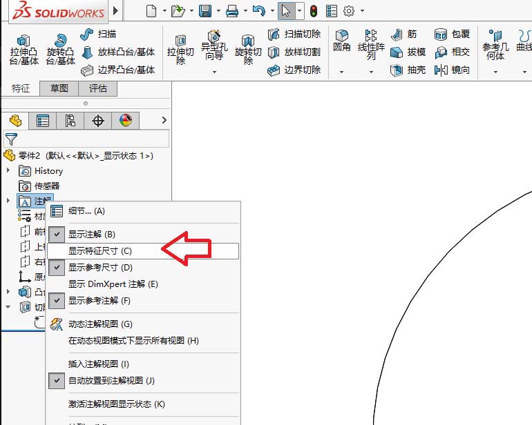 3、选择显示特征尺寸。下面会用到。