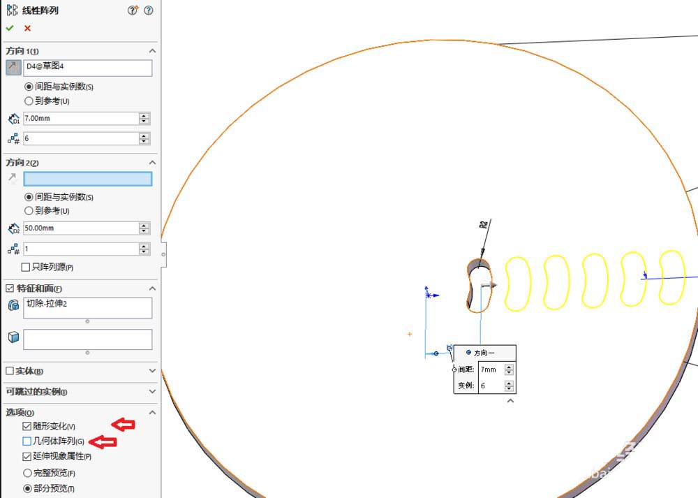 6、这时注意,点击 “随形阵列”,取消“几何体阵列”,这样就可以得到结果了。