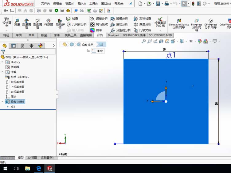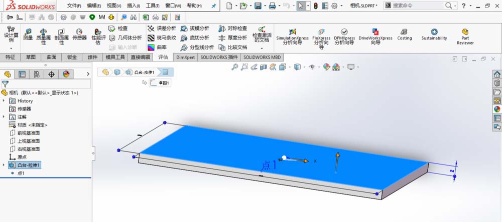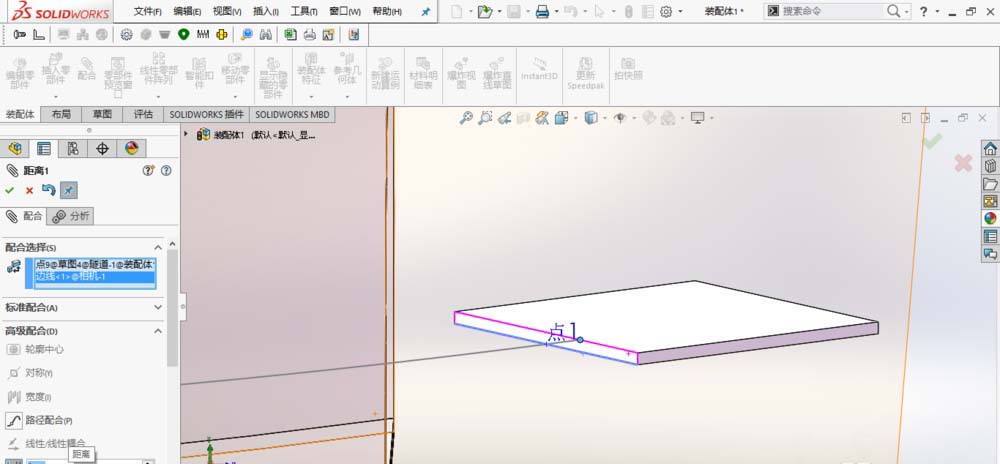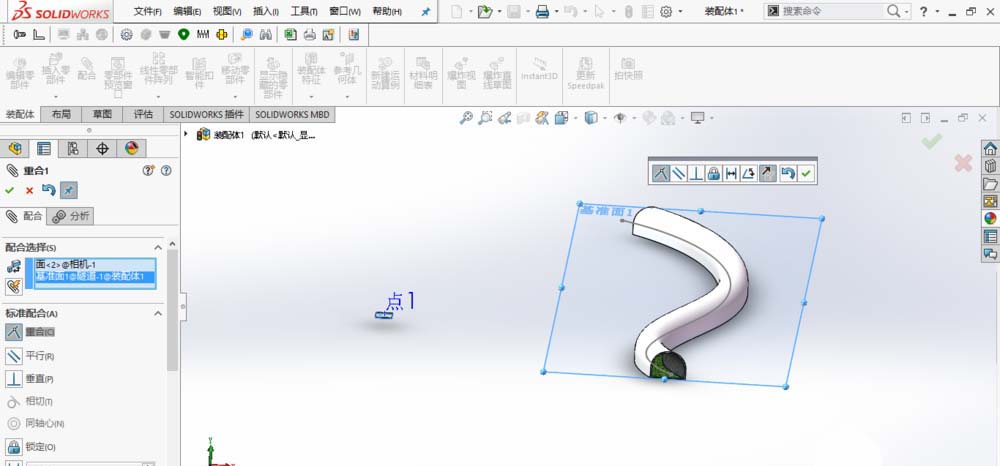 4、添加重合配合:点1所在的相机底面与基准面1重合,并保正相机整体位置在基准面1之上。