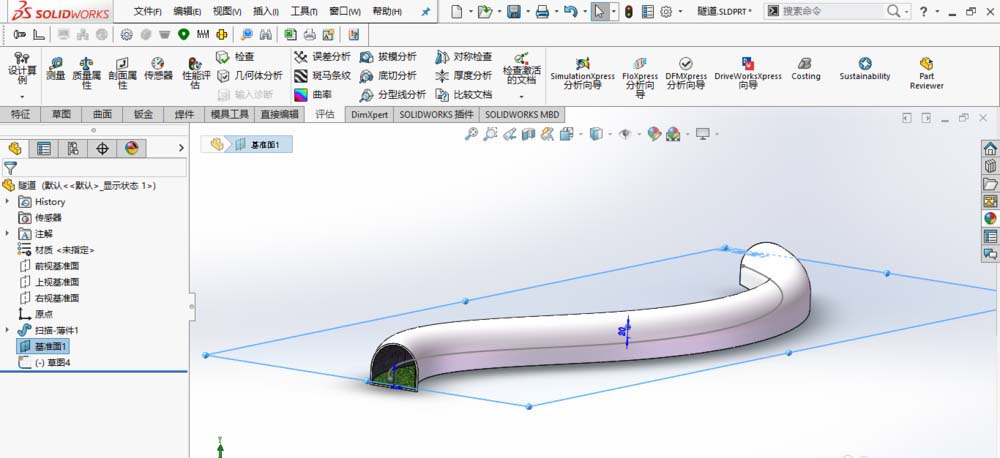 2、为隧道模型添加如图所示的参考基准面和参考草图。参考基准面相对于上视基准面偏移“20 mm”,参考草图为参考基准面上正中于隧道的与隧道轮廓相同的样条曲线。