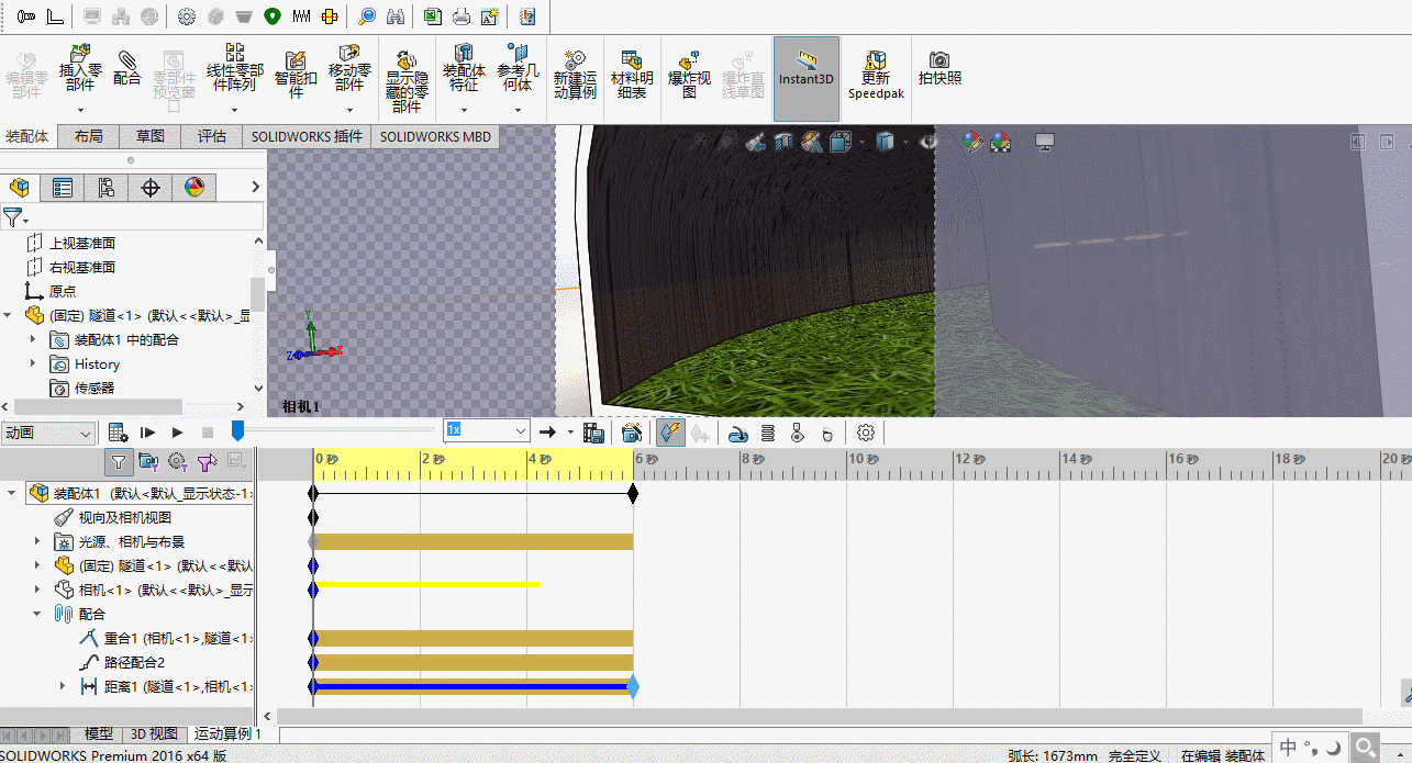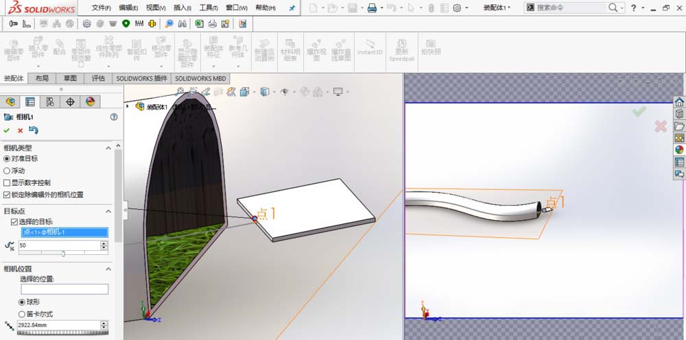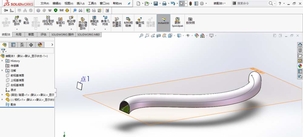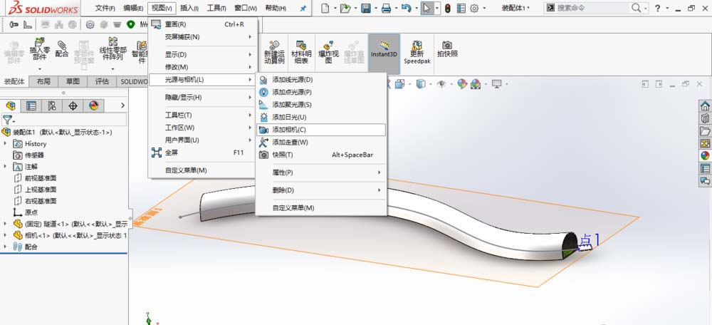 3、在SolidWorks中新建一个装配体。插入隧道和相机零件模型,并使基准面、草图和点可见。