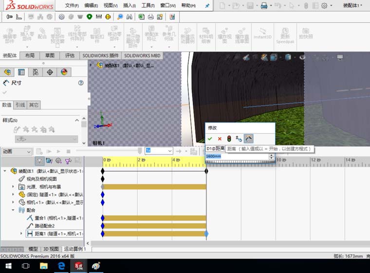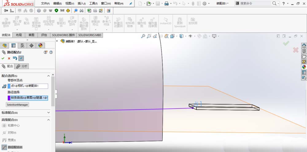 6、添加距离配合:选择样条曲线的端点和相机的一条边线,如图所示,设置距离为“1 mm”,单击确定。至此完成所有配合的添加。