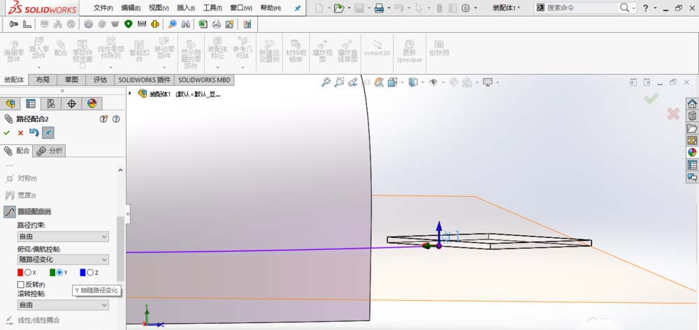 5、添加路径配合:零部件顶点选择点1,路径选择草图中的样条曲线,俯仰/偏航控制选择“随路径变化”,选中“Y轴”,如图所示,单击确定。