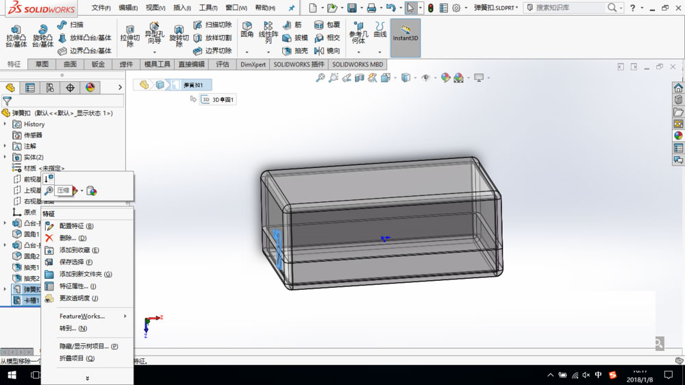 1、打开SolidWorks基体模型,压缩其中的弹簧扣和卡槽特征。基体模型的创建方法可参考这篇经验