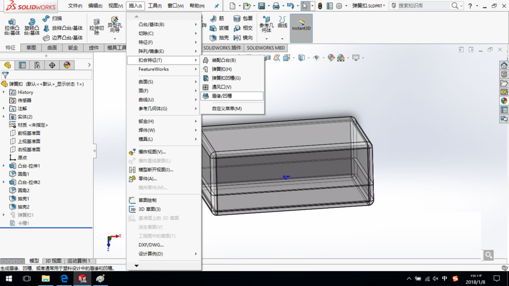 2、单击“插入—扣合特征—唇缘凹槽”命令。