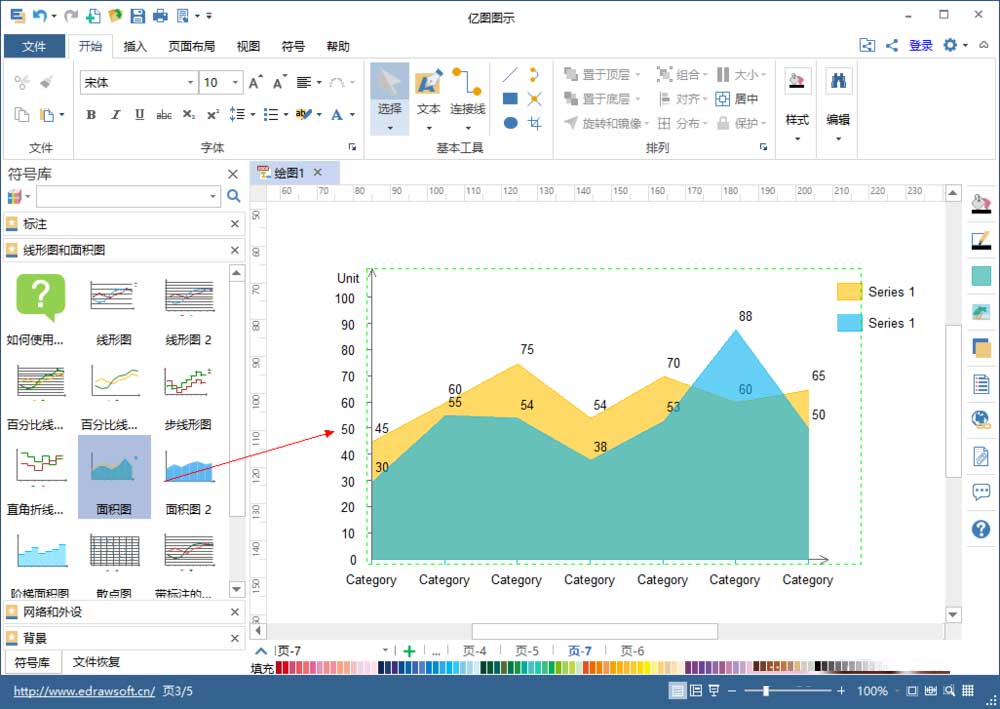 3、如果不借助模板或符号,从零开始绘制面积图,是比较复杂的,所以我们可以从左侧符号库中,选择合适的面积图模板来帮助提高效率,用鼠标拖动至画布中即可