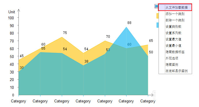 4、然后将数据导入进去,在图表编辑画布里,鼠标移近图表,即可出现浮动按钮。点击第一项“从文件加载数据”,并选择刚才编辑好的文本,即可一键导入